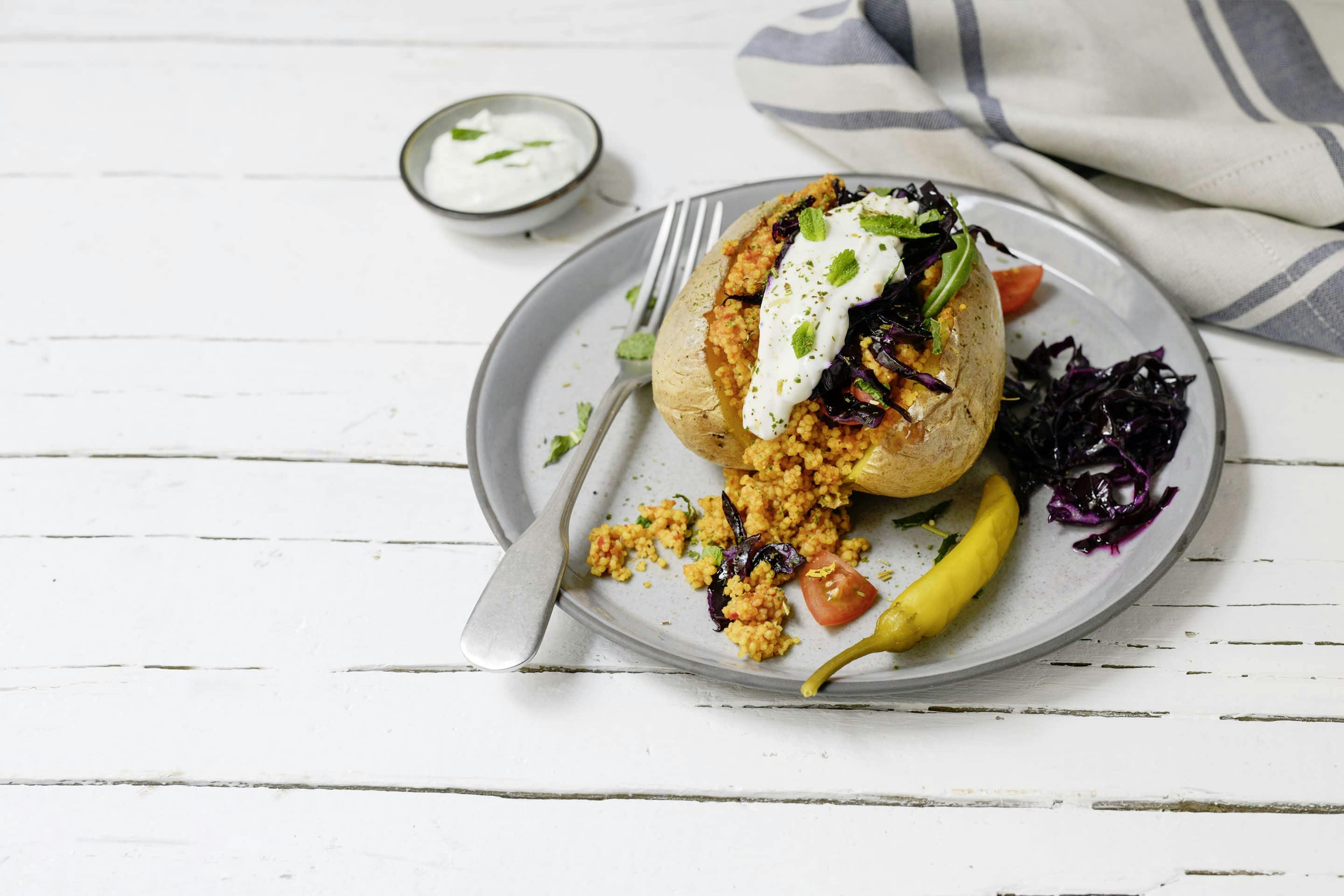 Pečené zemiaky s kuskusom a červenou kapustou